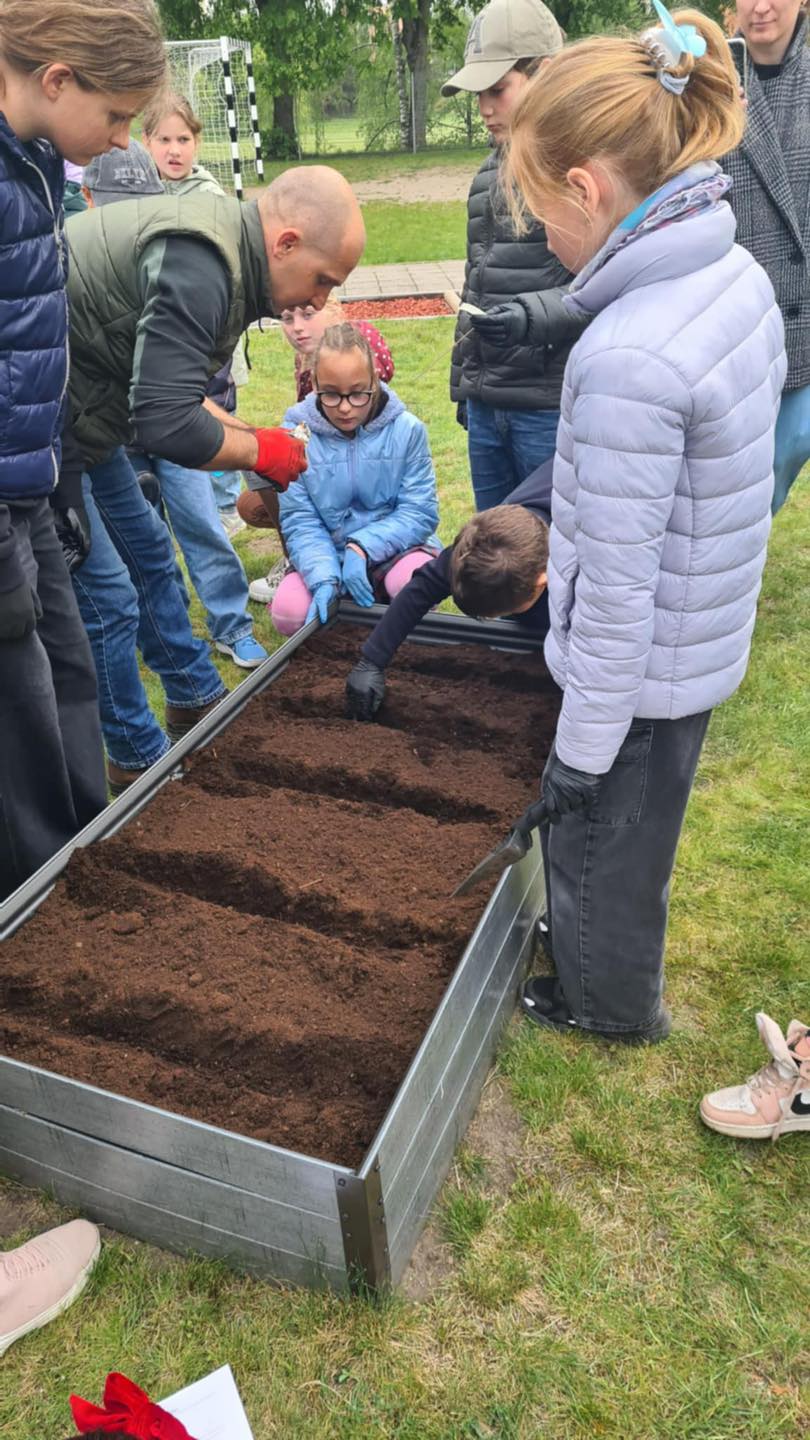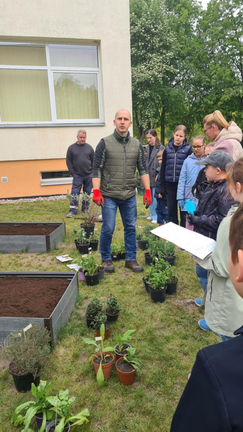 Kartu su mokiniais, sėjo ir sodino vaistažolių sodinukus mokyklos lauko lysvėse. Šiuo metu mūsų lauko lysvėse auga 11 rūšių vaistinių augalų.